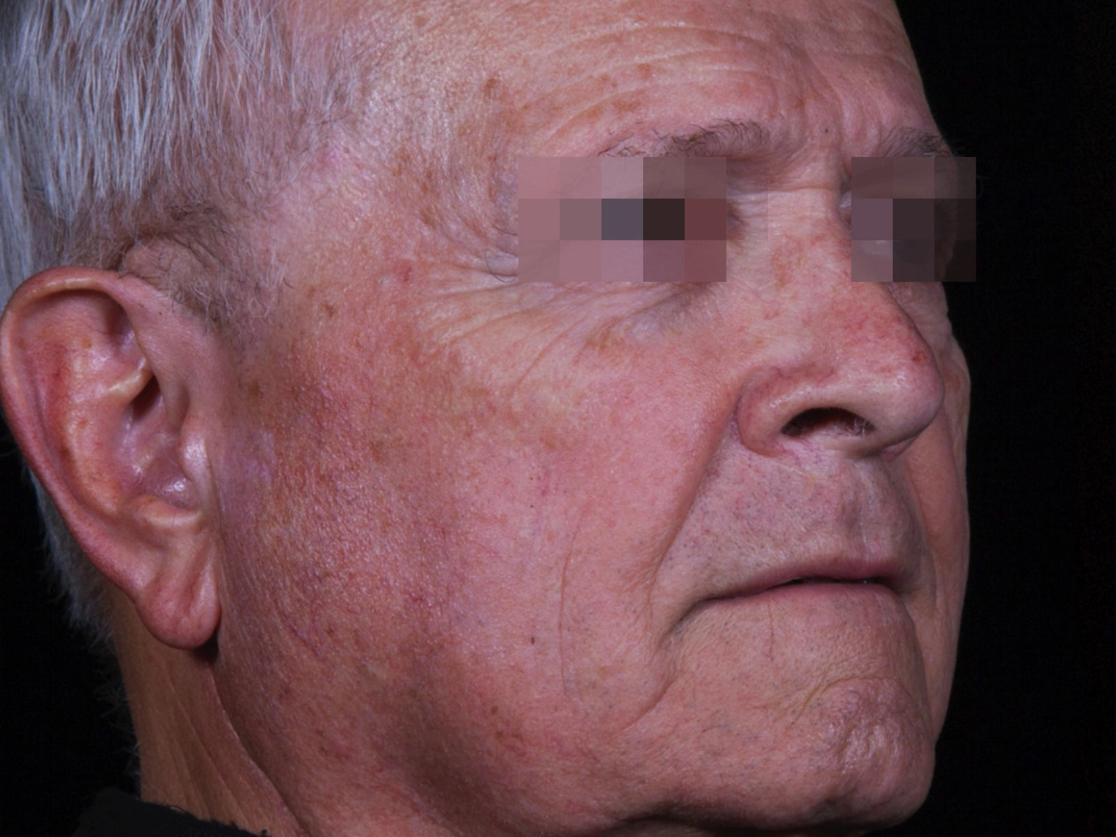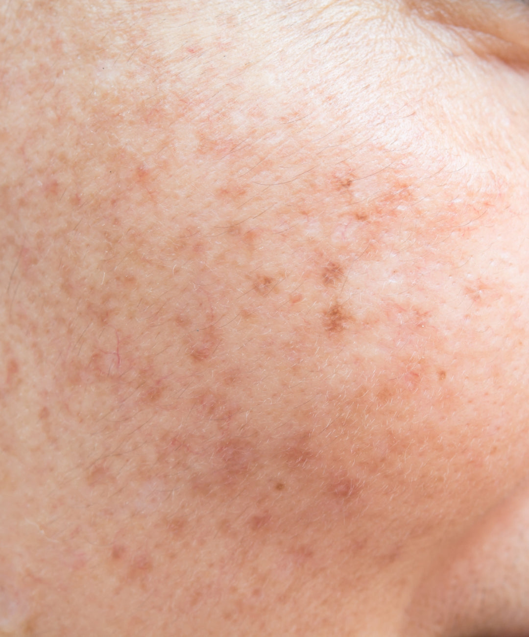 General blotchiness or pigment clusters on the face, neck, chest, and hands.