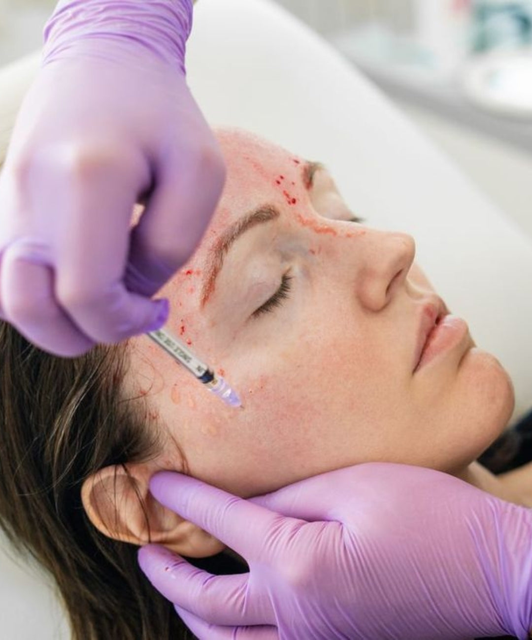 PRP therapy begins with a simple blood draw, from which your plasma—the component rich in platelets and growth factors—is separated using a medical centrifuge. This concentrated “liquid gold” is then re-injected or needled into targeted areas of the face, where it stimulates cell regeneration, collagen production, and skin healing.